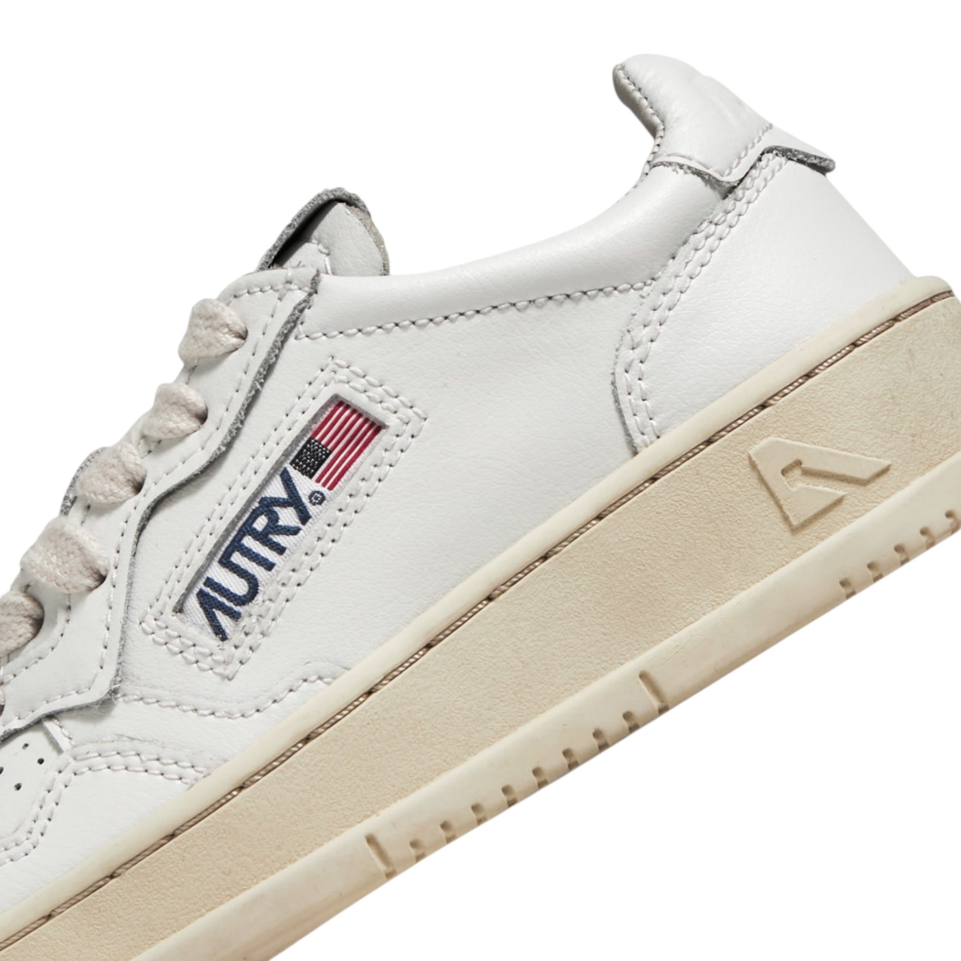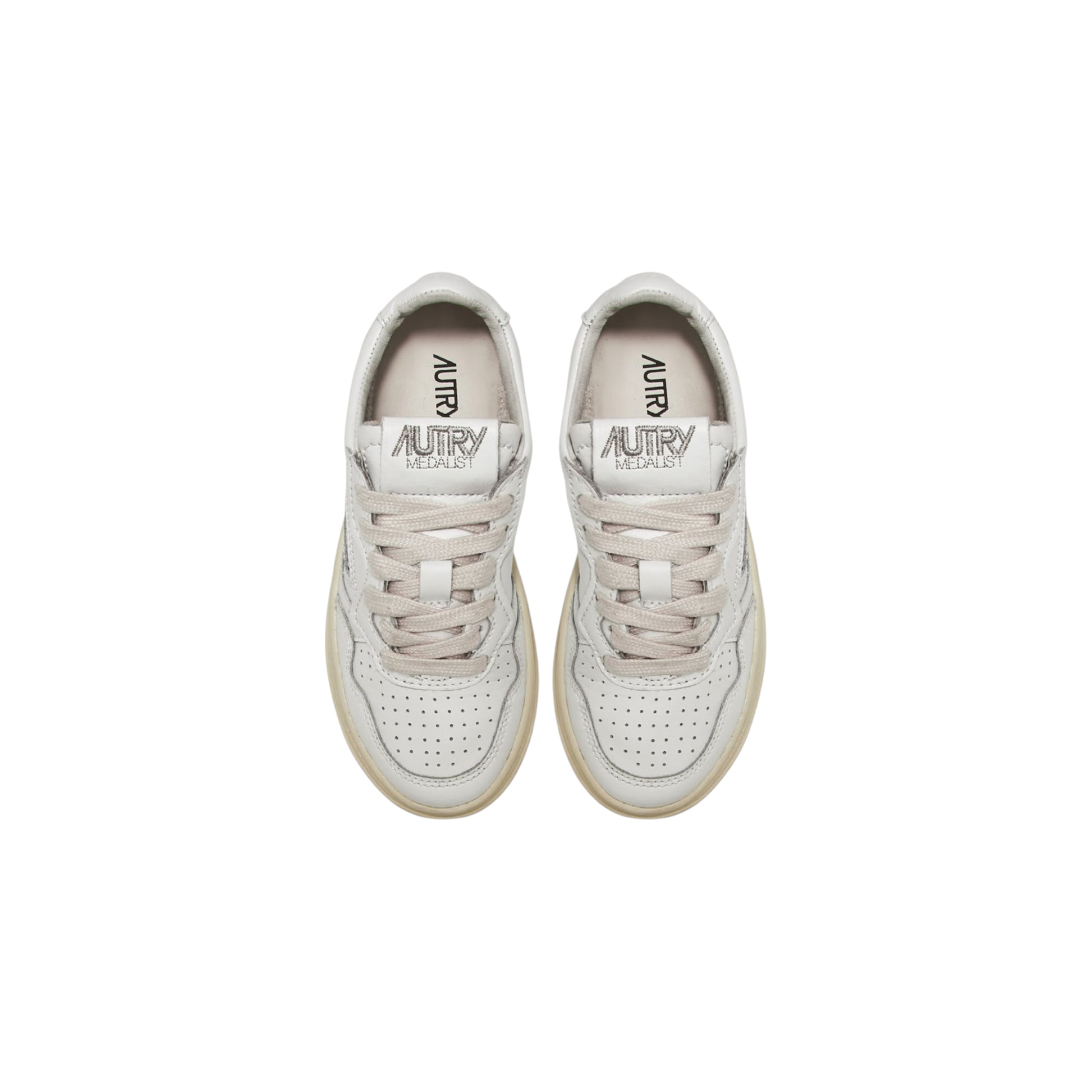 Tomaia in pelle bianca con impunture che definiscono gli inserti multistrato in tono.
