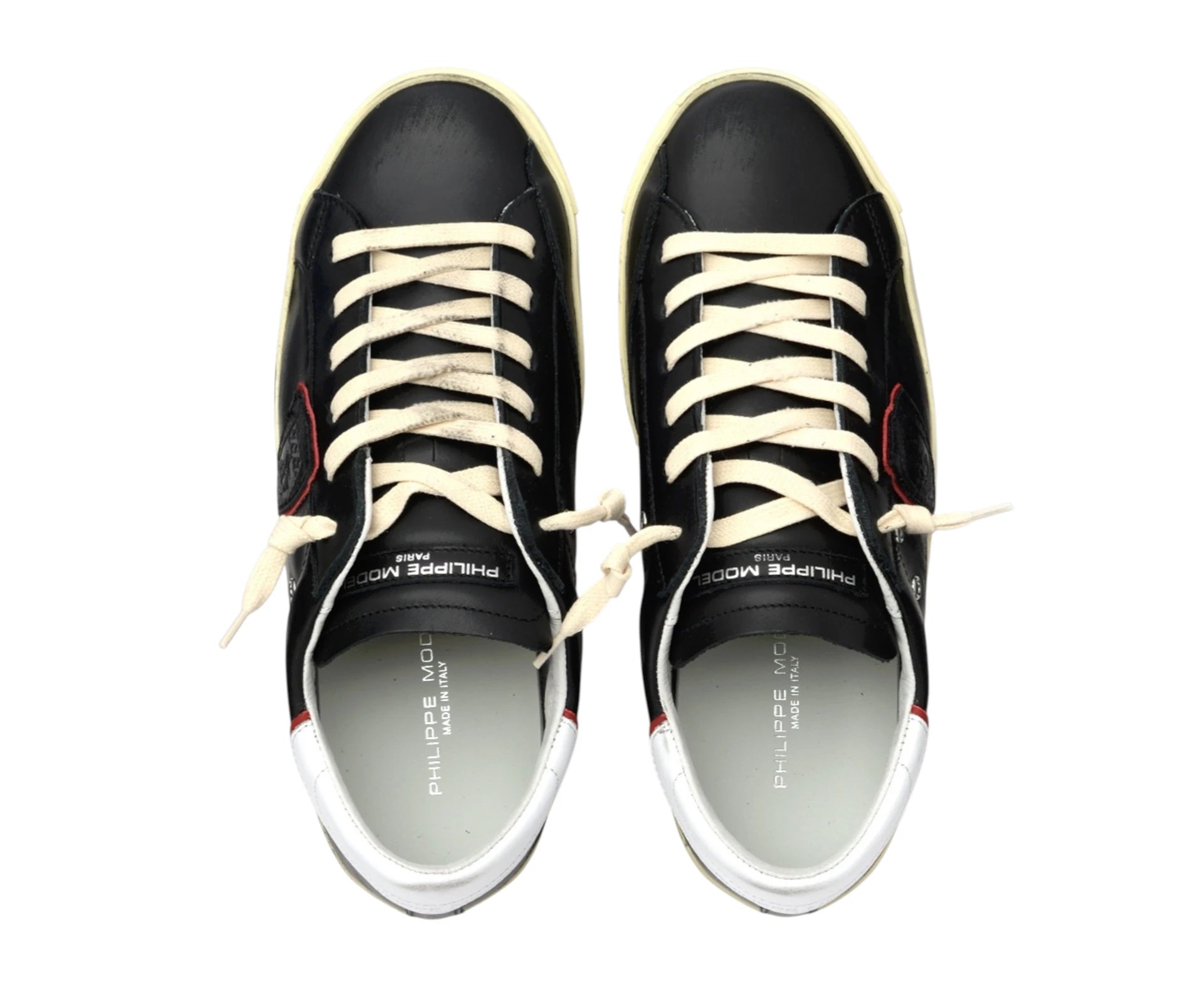 Sneaker Philippe Model modello Paris X realizzata in pelle nera con spoiler bianco e rosso.