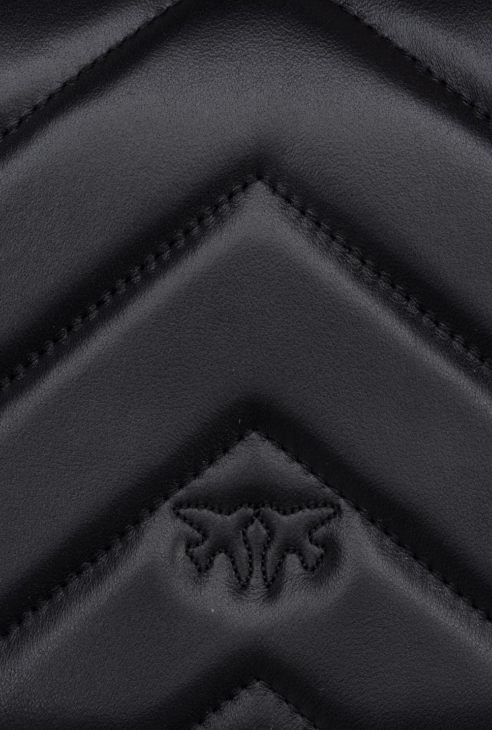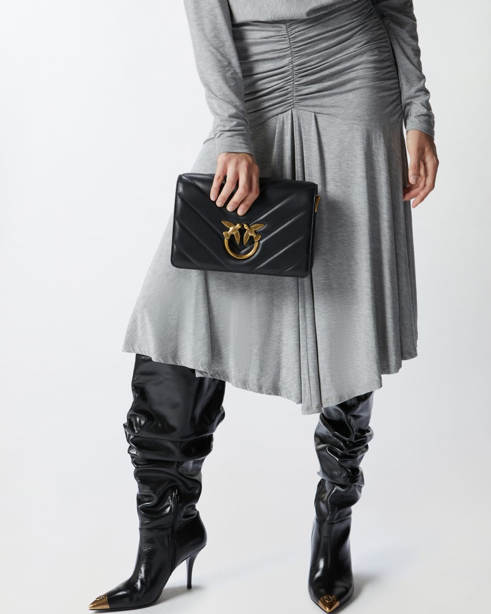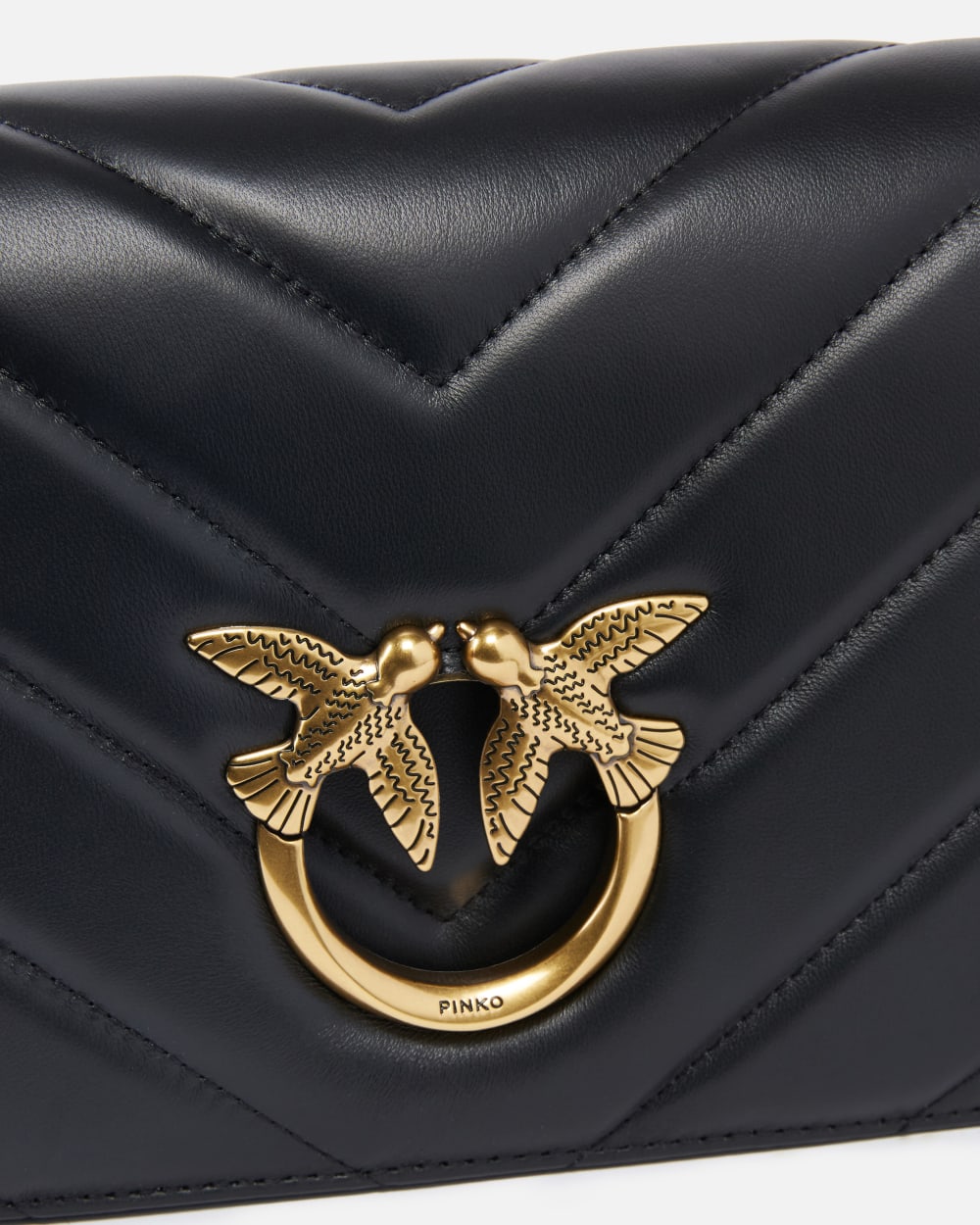 Classic Love Bag Click in nappa trapuntata con motivo chevron grande. La chiusura automatica nascosta è completata dall'iconica fibbia in metallo Love Birds Diamond Cut, galvanica antique gold, con effetto cut-out. L'interno è foderato in microfibra effetto scamosciato e comprende tramezza chiusa con zip e tasca a parete. La tracolla combina la catena metallica rotonda personalizzata con Love Birds al pratico spallaccio in pelle regolabile. Attiva la tua borsa PINKO: verifica l'autenticità del tuo prodotto e accedi all'esperienza personalizzata avvicinando il tuo smartphone al ricamo Love Birds che trovi sul retro della borsa!