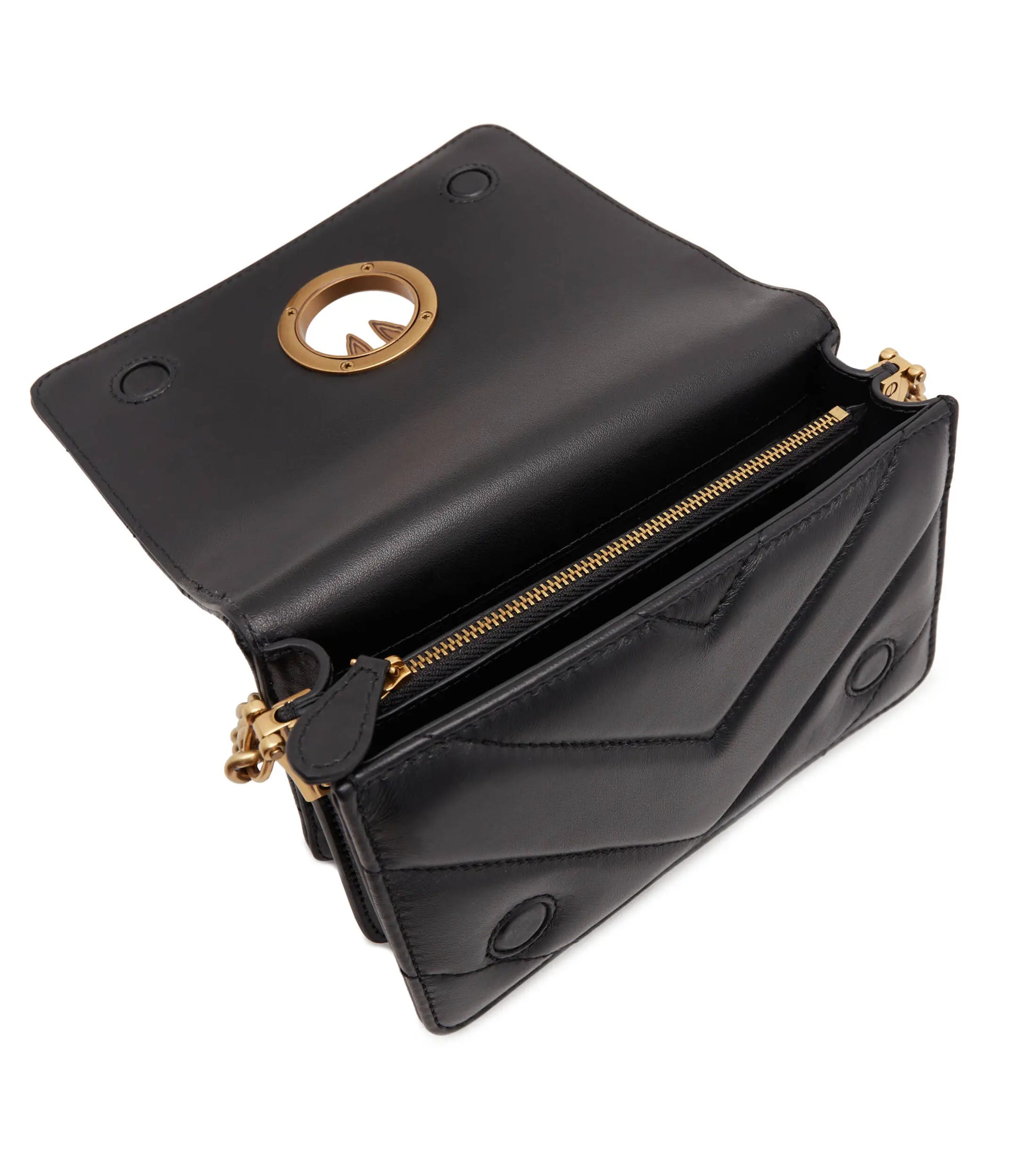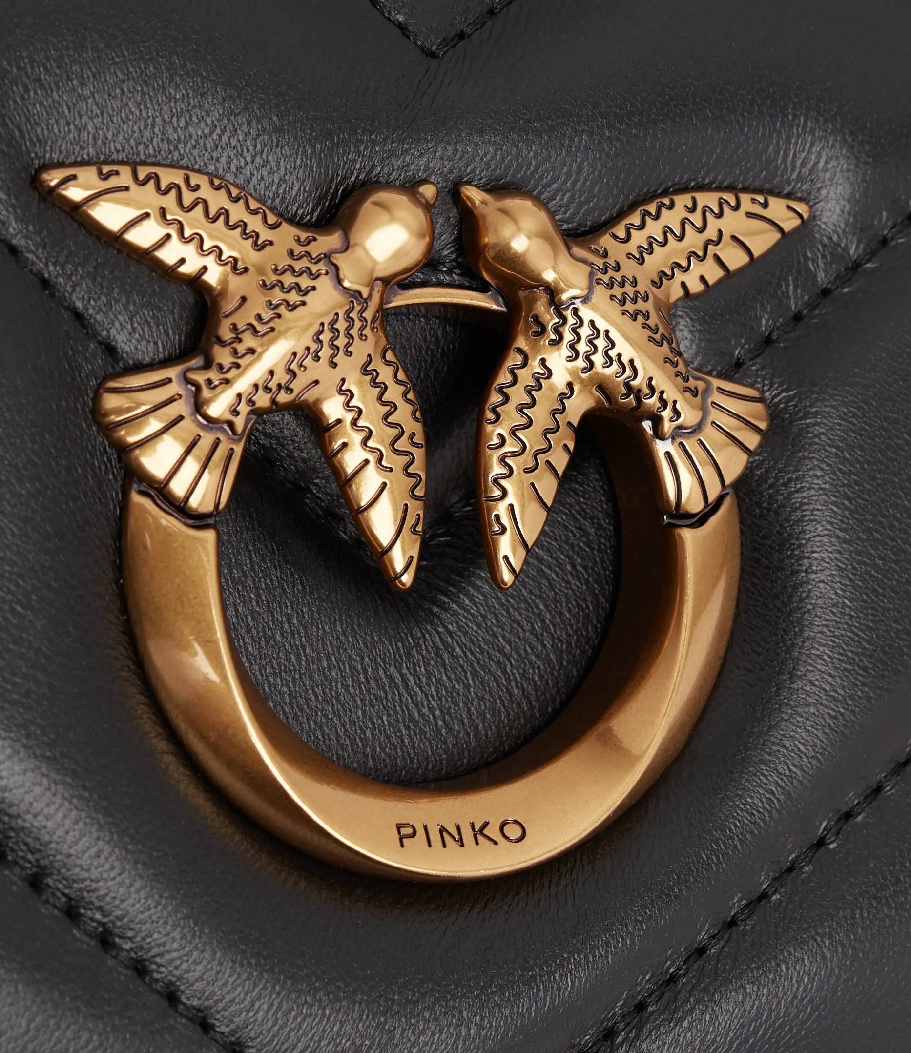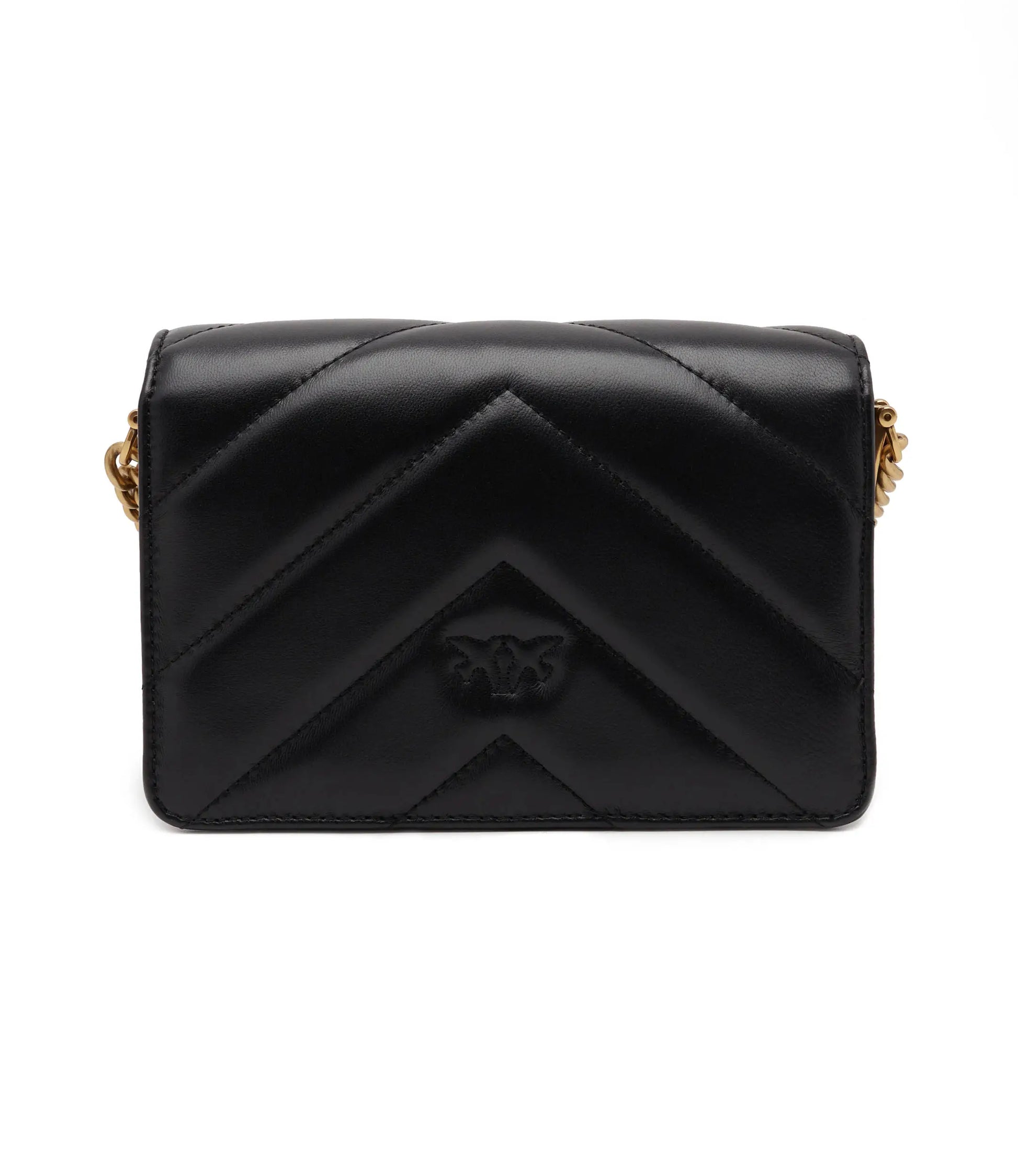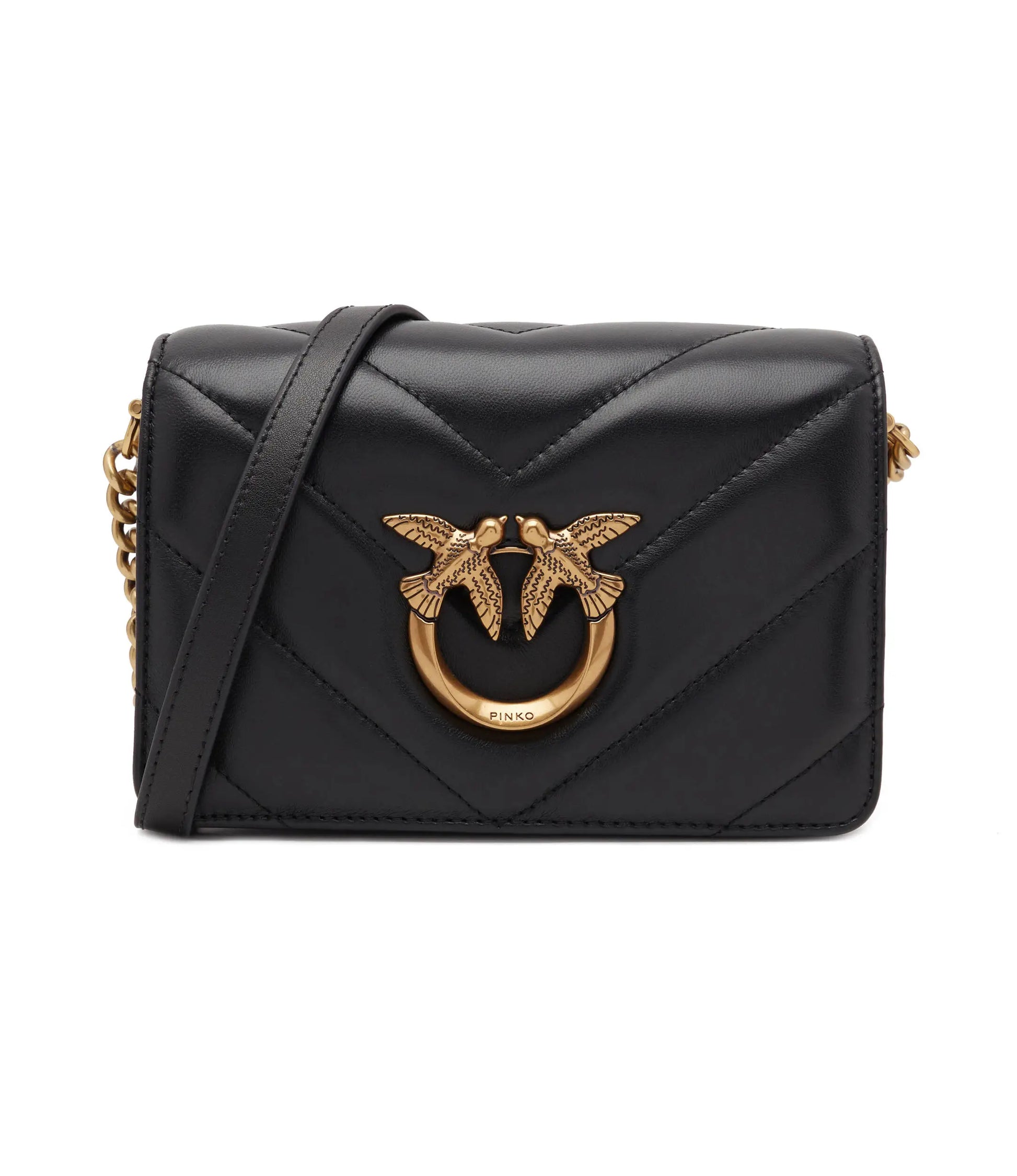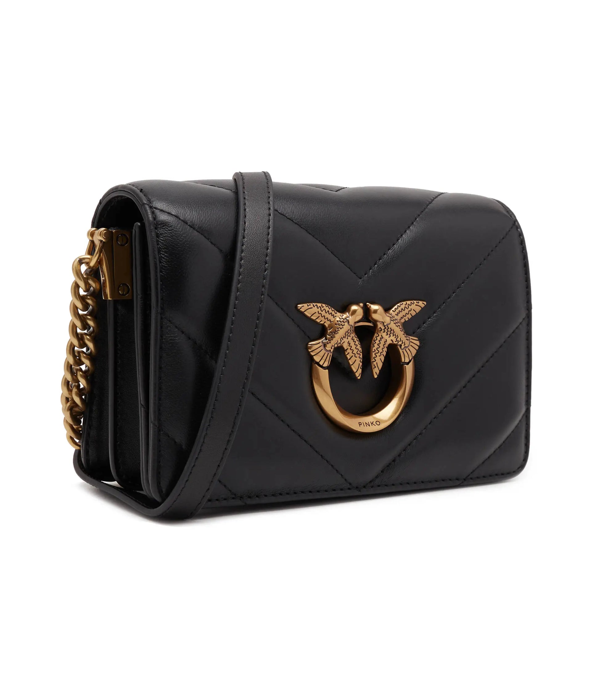 Mini Love Bag Click in nappa trapuntata con motivo chevron grande. La chiusura automatica nascosta è completata dall'iconica fibbia in metallo Love Birds Diamond Cut con effetto cut-out, galvanica antique gold. L'interno è foderato in microfibra scamosciata e comprende tramezza chiusa con zip e tasca a parete in pelle. La tracolla combina la classica catena rotonda al pratico spallaccio regolabile in pelle.