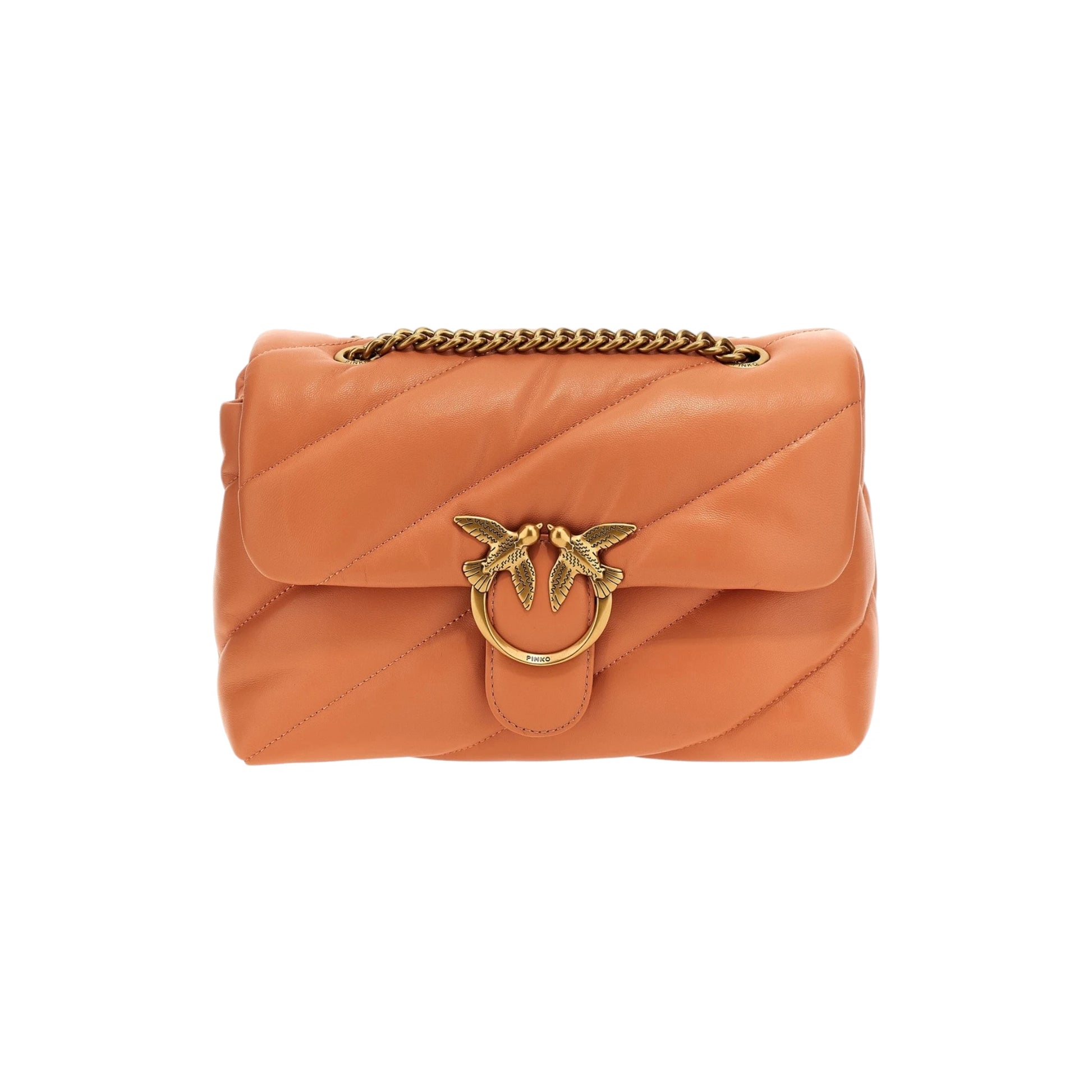 Tracolla 'Love Puff Classic' in nappa trapuntata, chiusura flap magnetica con applicazione logo metallico, manico catena scorrevole con protezione in pelle.